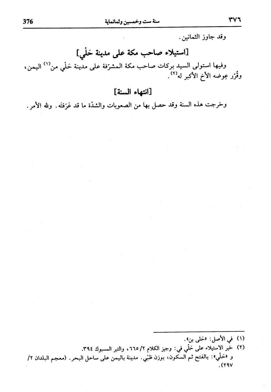 (¬2) خبر الاستيلاء على حلي في: وجيز الكلام 2/ 665، والتبر المسبوك 394. و «حلي»: بالفتح ثم السكون، بوزن ظبي. مدينة باليمن على ساحل البحر. (معجم البلدان 2/ 297).