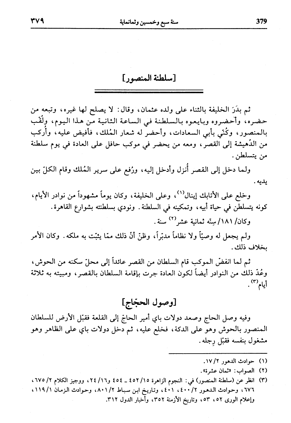 (¬3) انظر عن (سلطنة المنصور) في: النجوم الزاهرة 15/ 452 - 454 و 16/ 24، ووجيز الكلام 2/ 675، 676، وحوادث الدهور 2/ 400، 401، وتاريخ ابن سباط 2/ 801، وحوادث الزمان 1/ 119، وإعلام الورى 52، 53، وتاريخ الأزمنة 352، وأخبار الدول 312.