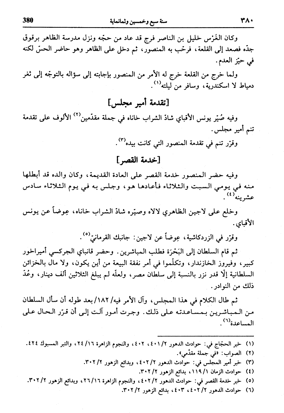 (¬5) خبر خدمة القصر في: حوادث الدهور 2/ 402، والنجوم الزاهرة 16/ 26، وبدائع الزهور 2/ 302.