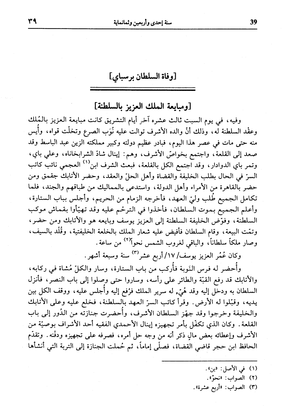وفيه، في يوم السبت ثالث عشره آخر أيام التشريق كانت مبايعة العزيز بالملك وعقد السلطنة له، وذلك أنّ والده الأشرف توالت عليه نوب الصرع وتخلّت قواه، وأيس منه حتى مات في عصر هذا اليوم، فبادر عظيم دولته وكبير مملكته الزين عبد الباسط وقد صعد إلى القلعة، واجتمع بخواصّ الأشرف، وهم: إينال شادّ الشرابخاناه، وعلي باي، وتمر باي الدوادار، وقد اجتمع الكل بالقلعة، فبعث الشرف ابن (¬1) العجمي نائب كاتب السرّ في الحال بطلب الخليفة والقضاة وأهل الحلّ والعقد، وحضر الأتابك جقمق ومن حضر بالقاهرة من الأمراء وأهل الدولة، واستدعى بالمماليك من طباقهم والجند، فلما تكامل الجميع طلب وليّ العهد، فأخرجه الزمام من الحريم، وأجلس بباب الستارة، وأعلم الجميع بموت السلطان، فأخذوا في الترحّم عليه وقد تهيّأوا بقماش موكب السلطنة، وفوّض الخليفة السلطنة إلى العزيز يوسف وبايعه هو والأتابك ومن حضر، وتمّت البيعة، وقام السلطان فأفيض عليه شعار الملك بالخلعة الخليفتية، وقلّد بالسيف، وصار ملكا سلطانا، والباقي لغروب الشمس نحوا (¬2) من ساعة.
