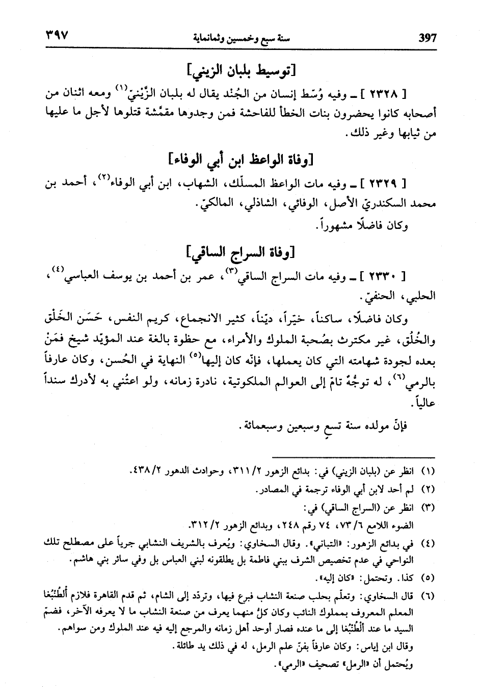 (¬3) انظر عن (السراج الساقي) في: الضوء اللامع 6/ 73، 74 رقم 248، وبدائع الزهور 2/ 312.