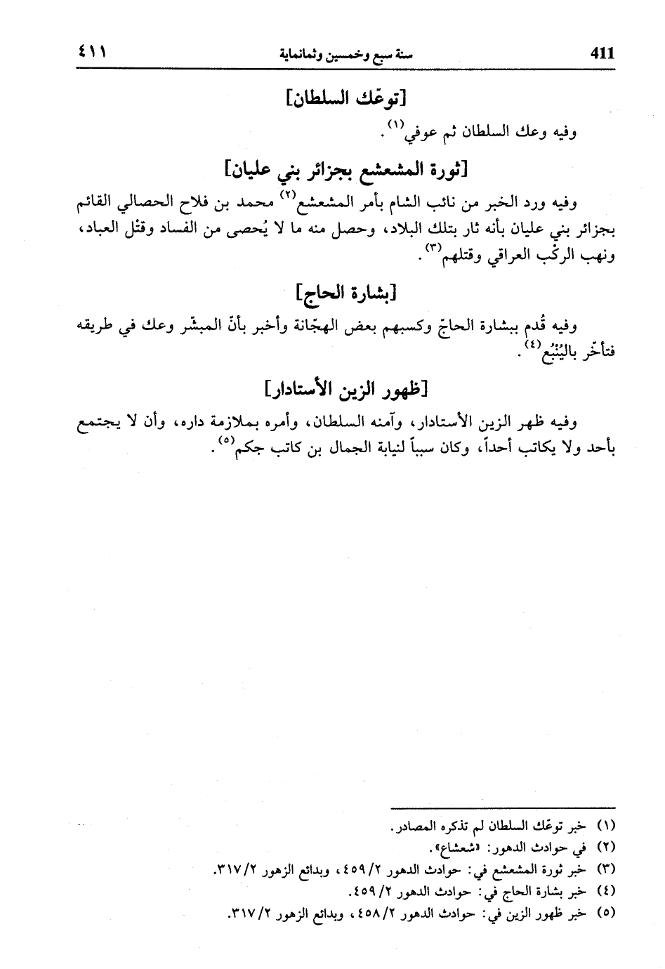 (¬5) خبر ظهور الزين في: حوادث الدهور 2/ 458، وبدائع الزهور 2/ 317.
