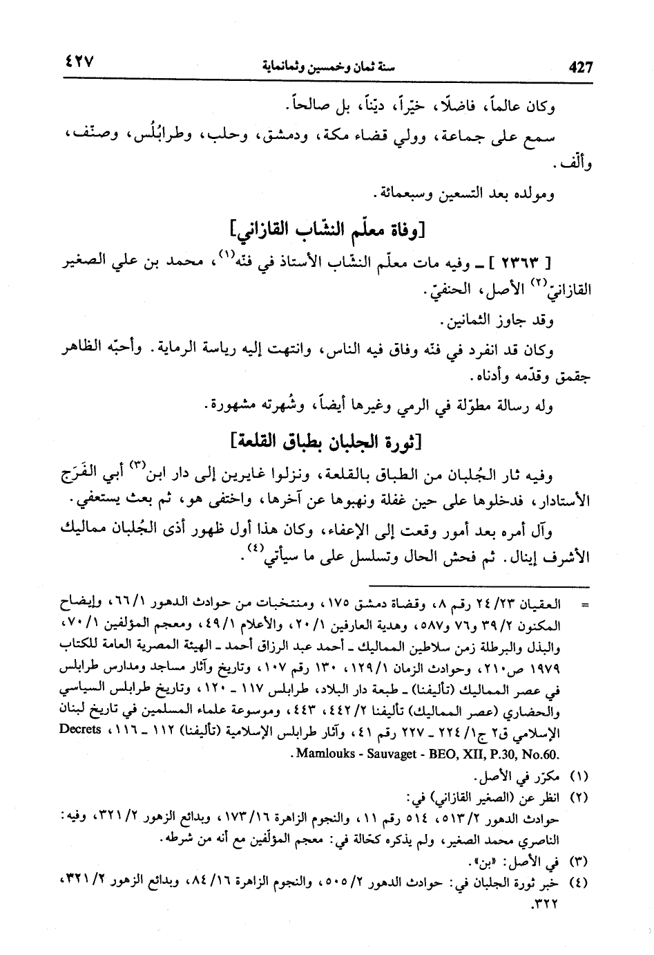 (¬4) خبر ثورة الجلبان في: حوادث الدهور 2/ 505، والنجوم الزاهرة 16/ 84، وبدائع الزهور 2/ 321، 322.