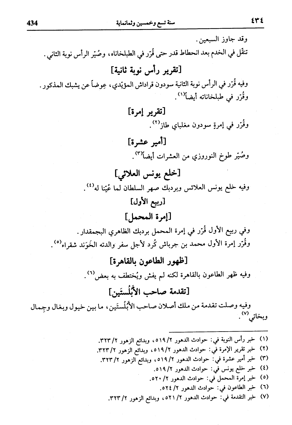 (¬7) خبر التقدمة في: حوادث الدهور 2/ 521، وبدائع الزهور 2/ 323.
