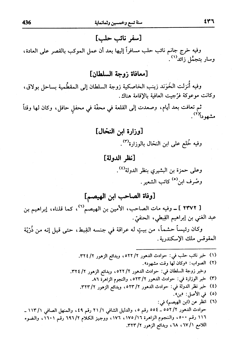 (¬6) انظر عن (ابن الهيصم) في: حوادث الدهور 2/ 552 - 554 رقم 5، والدليل الشافي 1/ 21 رقم 49، والمنهل الصافي 1/ 113 - 116 رقم 500، والنجوم الزاهرة 16/ 175، 176، ووجيز الكلام 2/ 696 رقم 1601، والضوء اللامع 1/ 67، 68، وبدائع الزهور 2/ 323.