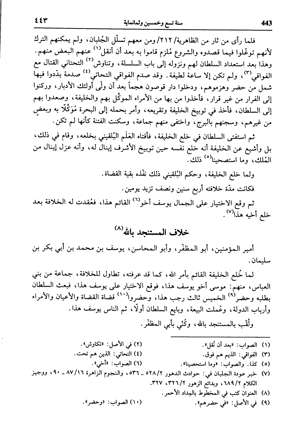 فلما رأى من ثار من الظاهرية / 212 / ومن معهم تسلّل الجلبان، ولم يمكنهم الترك لأنهم توغّلوا فيما قصدوه والشروع ملزم قاموا به بعد أن أنقل (¬1) عنهم البعض منهم. وهذا بعد استعداد السلطان لهم ونزوله إلى باب السلسلة، وتناوش (¬2) التحتاني القتال مع الفواقي (¬3)، ولم تكن إلا ساعة لطيفة. وقد صدم الفواقي التحاتي (¬4) صدمة بدّدوا فيها شمل من حضر وهزموهم، ودخلوا دار قوصون هجما بعد أن ولّى أولئك الأدبار، وركنوا إلى الفرار من غير قرار، فأخذوا من بها من الأمراء الموكّل بهم والخليفة، وصعدوا بهم إلى السلطان، فأخذ في توبيخ الخليفة وتقريعه، وأمر بحمله إلى البحرة موكّلا به وبعض من غيرهم، وسجنهم بالبرج، واختفى منهم جماعة، وسكنت الفتنة كأنها لم تكن.
