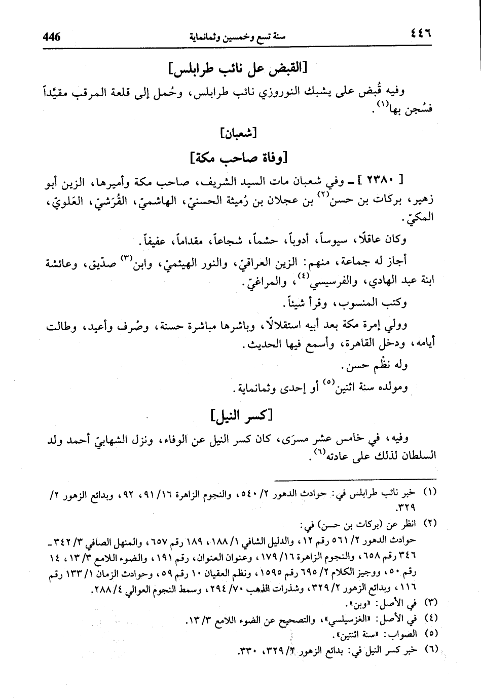 (¬2) انظر عن (بركات بن حسن) في: حوادث الدهور 2/ 561 رقم 12، والدليل الشافي 1/ 188، 189 رقم 657، والمنهل الصافي 3/ 342 - 346 رقم 658، والنجوم الزاهرة 16/ 179، وعنوان العنوان، رقم 191، والضوء اللامع 3/ 13، 14 رقم 50، ووجيز الكلام 2/ 695 رقم 1595، ونظم العقيان 10 رقم 59، وحوادث الزمان 1/ 133 رقم 116، وبدائع الزهور 2/ 329، وشذرات الذهب 70/ 294، وسمط النجوم العوالي 4/ 288.