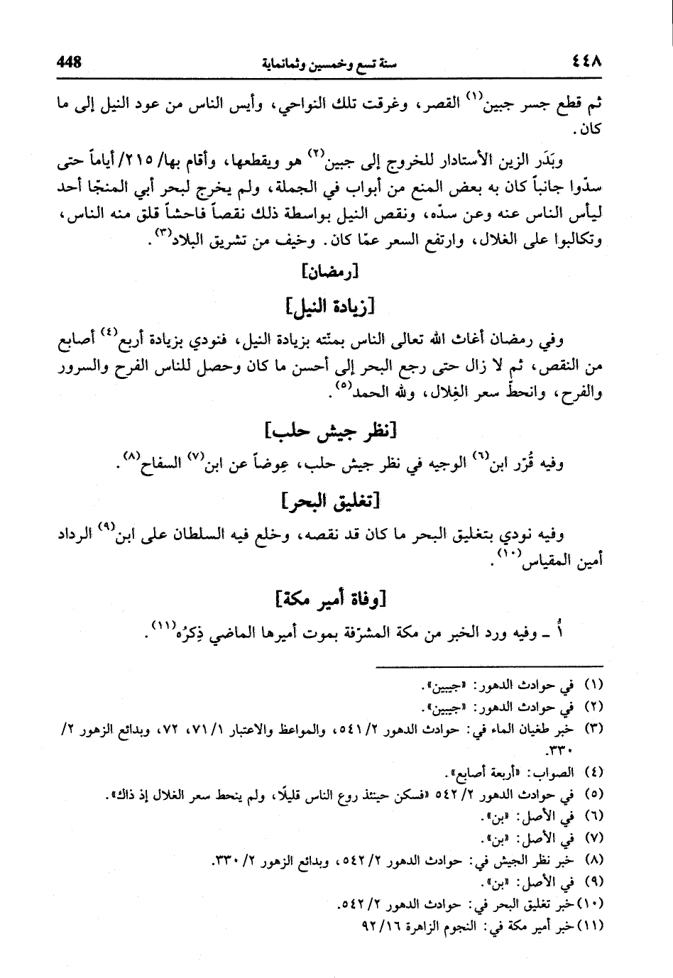 (¬5) في حوادث الدهور 2/ 542 «فسكن حينئذ روع الناس قليلا، ولم ينحط سعر الغلال إذ ذاك».