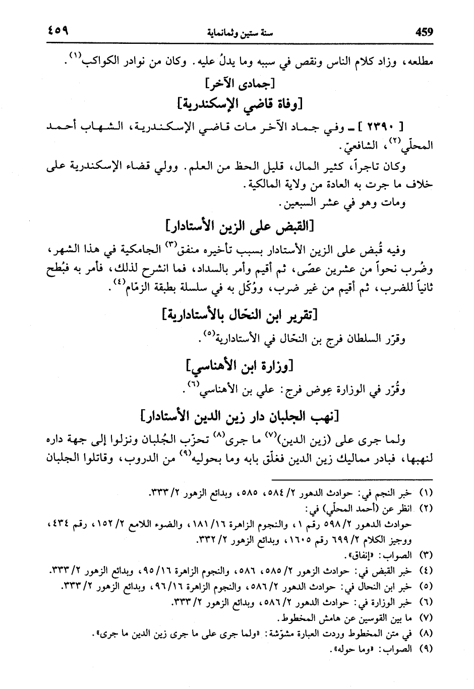 (¬5) خبر ابن النحال في: حوادث الدهور 2/ 586، والنجوم الزاهرة 16/ 96، وبدائع الزهور 2/ 333.
