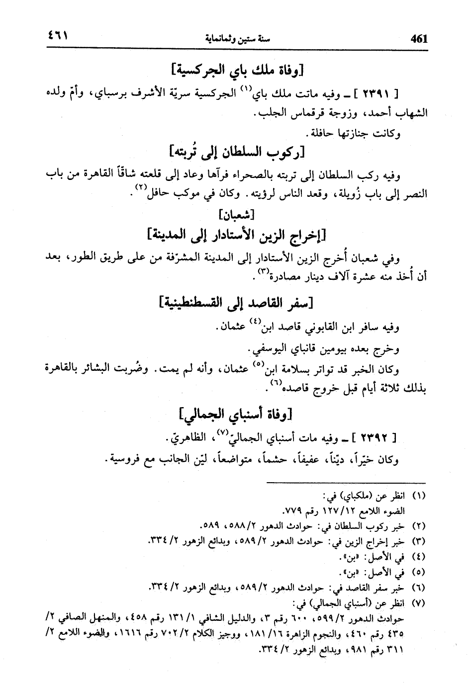 (¬7) انظر عن (أسنباي الجمالي) في: حوادث الدهور 2/ 599، 600 رقم 3، والدليل الشافي 1/ 131 رقم 458، والمنهل الصافي 2/ 435 رقم 460، والنجوم الزاهرة 16/ 181، ووجيز الكلام 2/ 702 رقم 1616، والضوء اللامع 2/ 311 رقم 981، وبدائع الزهور 2/ 334.