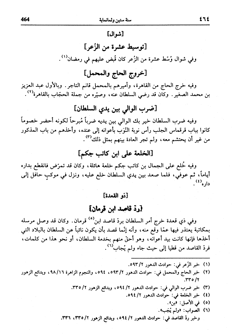 (¬2) خبر الحاج والمحمل في: حوادث الدهور 2/ 593، 594، والنجوم الزاهرة 16/ 98، وبدائع الزهور 2/ 335.