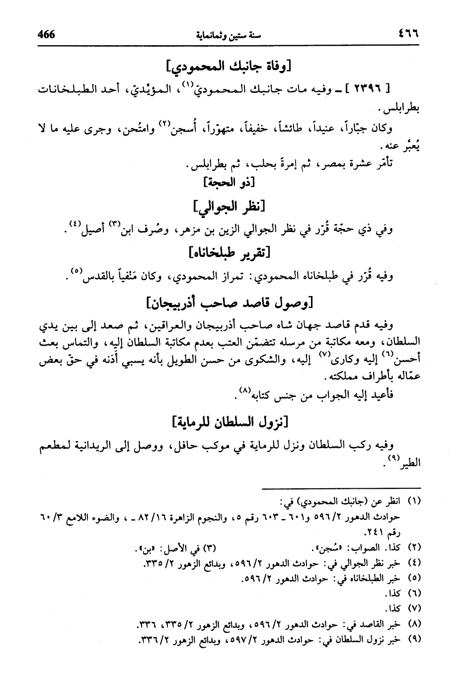 (¬1) انظر عن (جانبك المحمودي) في: حوادث الدهور 2/ 596 و 601 - 603 رقم 5، والنجوم الزاهرة 16/ 82 - ، والضوء اللامع 3/ 60 رقم 241.
