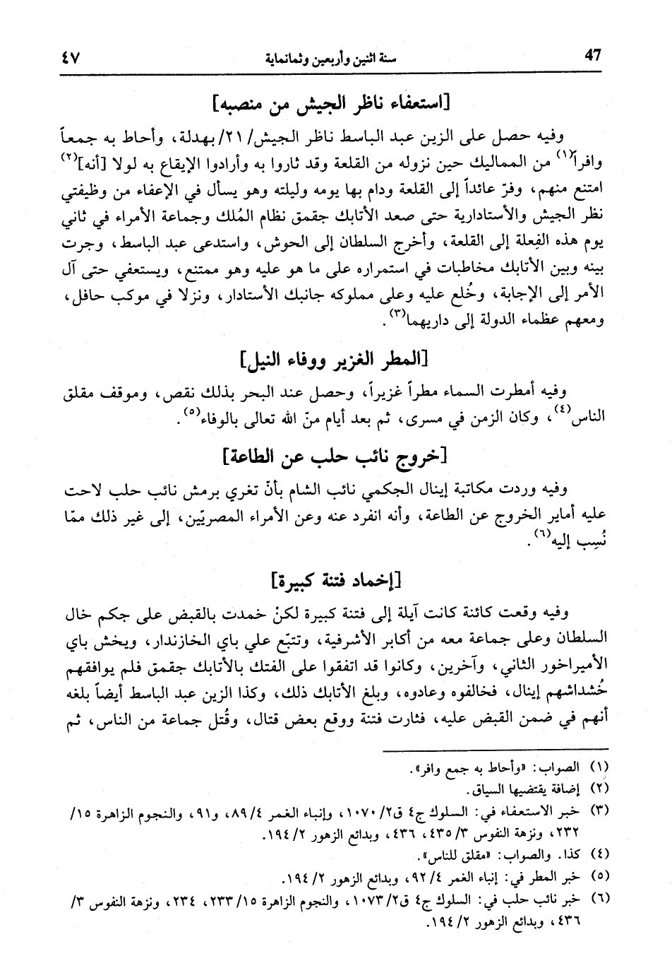(¬3) خبر الاستعفاء في: السلوك ج 4 ق 2/ 1070، وإنباء الغمر 4/ 89، و 91، والنجوم الزاهرة 15/ 232، ونزهة النفوس 3/ 435، 436، وبدائع الزهور 2/ 194.