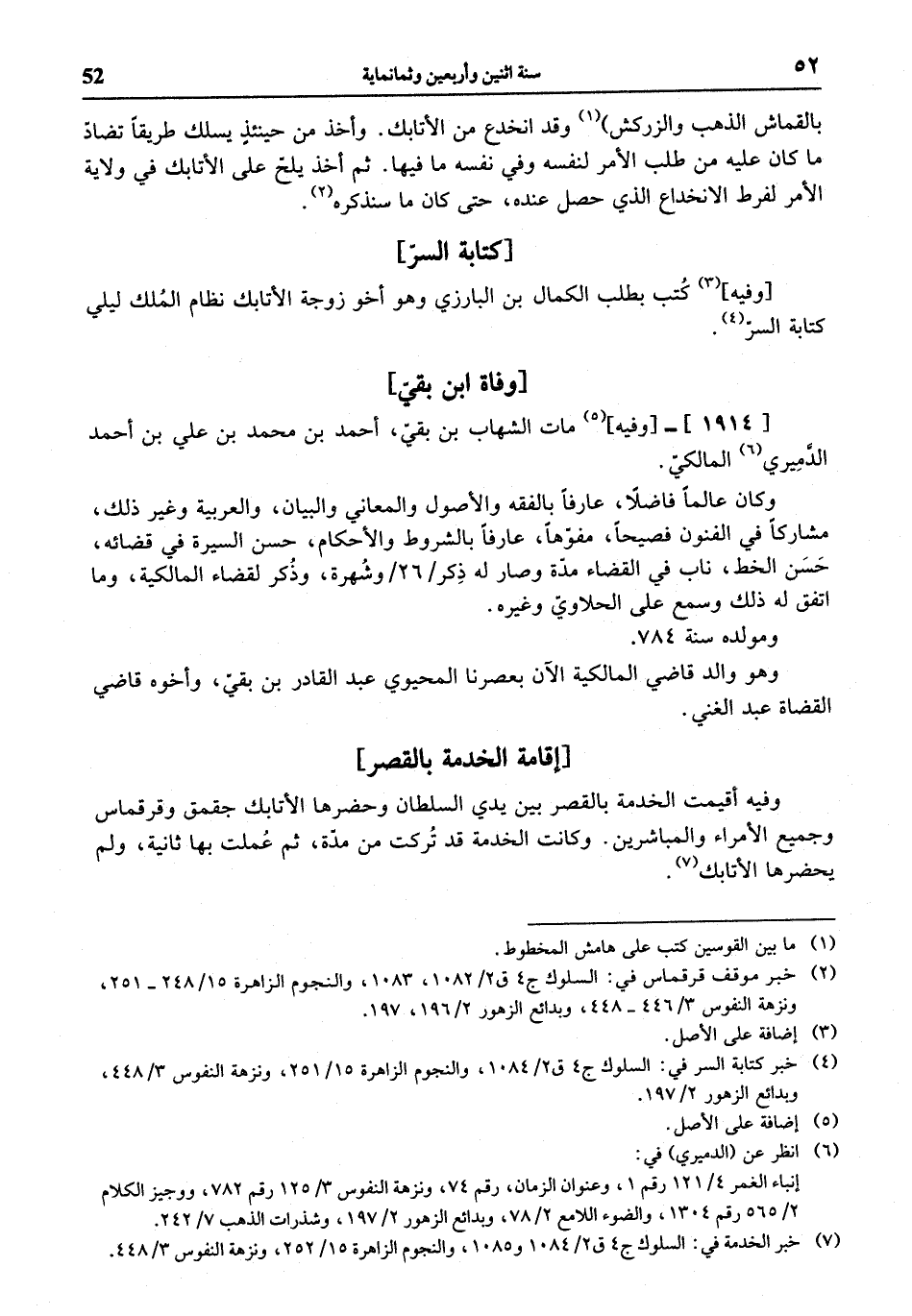 (¬4) خبر كتابة السر في: السلوك ج 4 ق 2/ 1084، والنجوم الزاهرة 15/ 251، ونزهة النفوس 3/ 448، وبدائع الزهور 2/ 197.