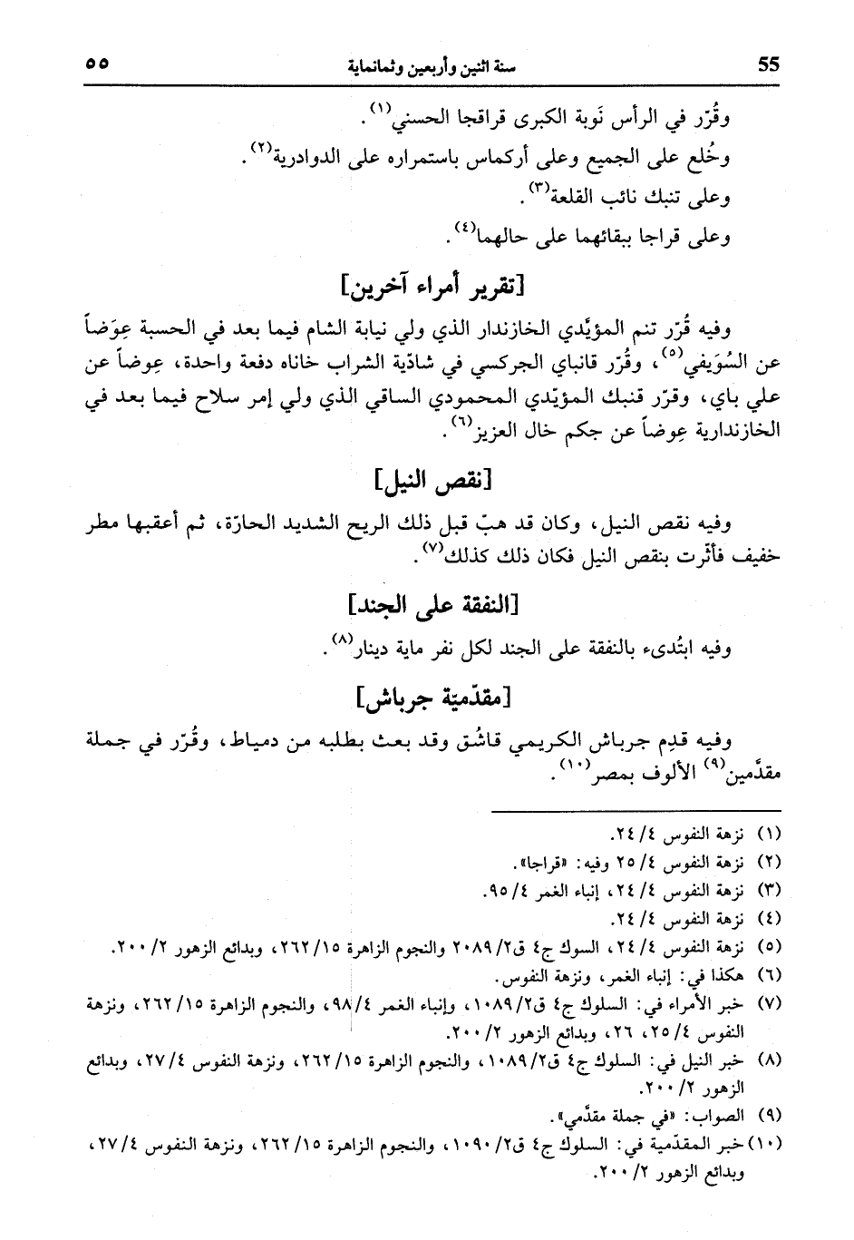 وفيه قرّر تنم المؤيّدي الخازندار الذي ولي نيابة الشام فيما بعد في الحسبة عوضا عن السويفي (¬5)، وقرّر قانباي الجركسي في شادّية الشراب خاناه دفعة واحدة، عوضا عن علي باي، وقرّر قنبك المؤيّدي المحمودي الساقي الذي ولي إمر سلاح فيما بعد في الخازندارية عوضا عن جكم خال العزيز (¬6).