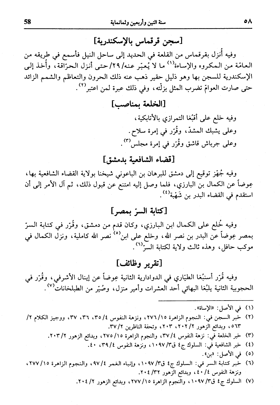 (¬6) خبر كتابة السر في: السلوك ج 4 ق 3/ 1097، وإنباء الغمر 4/ 97، والنجوم الزاهرة 15/ 277، ونزهة النفوس 4/ 40، وبدائع الزهور 32/ 204.
