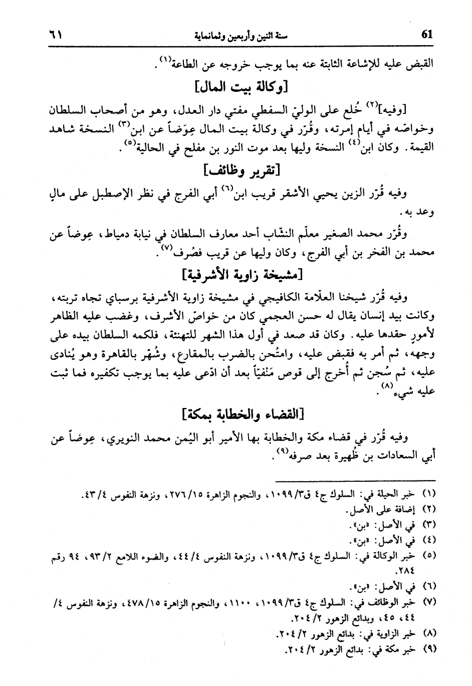 (¬7) خبر الوظائف في: السلوك ج 4 ق 3/ 1099، 1100، والنجوم الزاهرة 15/ 478، ونزهة النفوس 4/ 44، 45، وبدائع الزهور 2/ 204.