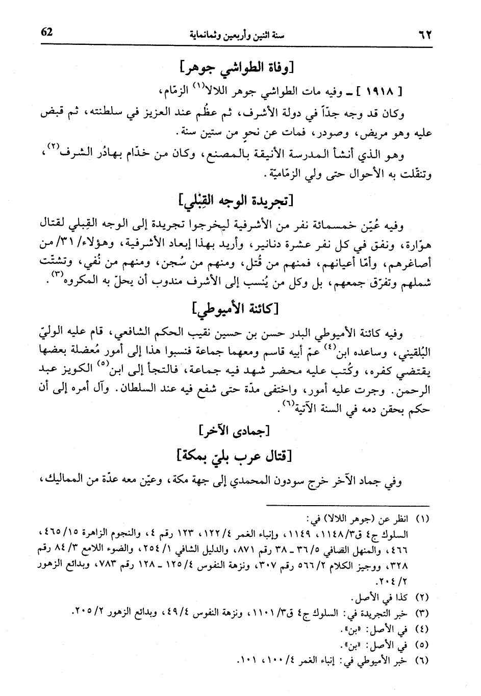 وفيه عيّن خمسمائة نفر من الأشرفية ليخرجوا تجريدة إلى الوجه القبلي لقتال هوّارة، ونفق في كل نفر عشرة دنانير، وأريد بهذا إبعاد الأشرفية، وهؤلاء / 31 / من أصاغرهم، وأمّا أعيانهم، فمنهم من قتل، ومنهم من سجن، ومنهم من نفي، وتشتّت شملهم وتفرّق جمعهم، بل وكل من ينسب إلى الأشرف مندوب أن يحلّ به المكروه (¬3).