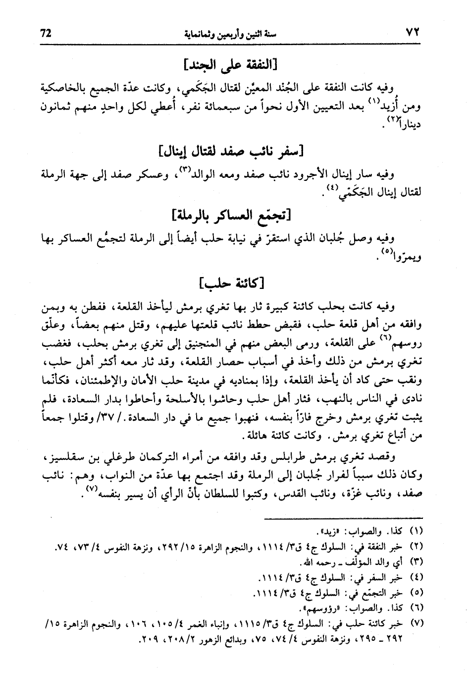 (¬7) خبر كائنة حلب في: السلوك ج 4 ق 3/ 1115، وإنباء الغمر 4/ 105، 106، والنجوم الزاهرة 15/ 292 - 295، ونزهة النفوس 4/ 74، 75، وبدائع الزهور 2/ 208، 209.