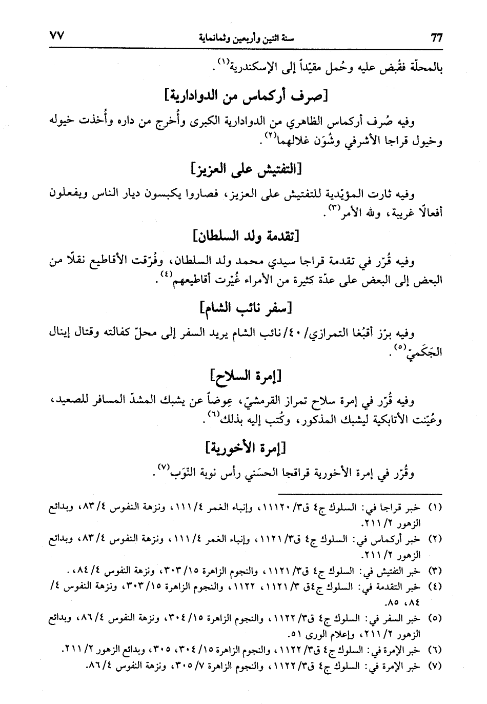 وفيه قرّر في تقدمة قراجا سيدي محمد ولد السلطان، وفرّقت الأقاطيع نقلا من البعض إلى البعض على عدّة كثيرة من الأمراء غيّرت أقاطيعهم (¬4).