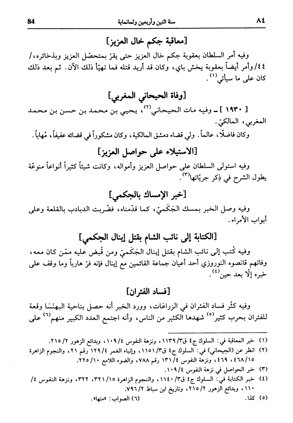 (¬2) انظر عن (الحيحاني) في: السلوك ج 4 ق 3/ 1151، وإنباء الغمر 4/ 129 رقم 21، والنجوم الزاهرة 15/ 468، 469، ونزهة النفوس 4/ 131 رقم 788، والضوء اللامع 10/ 225.