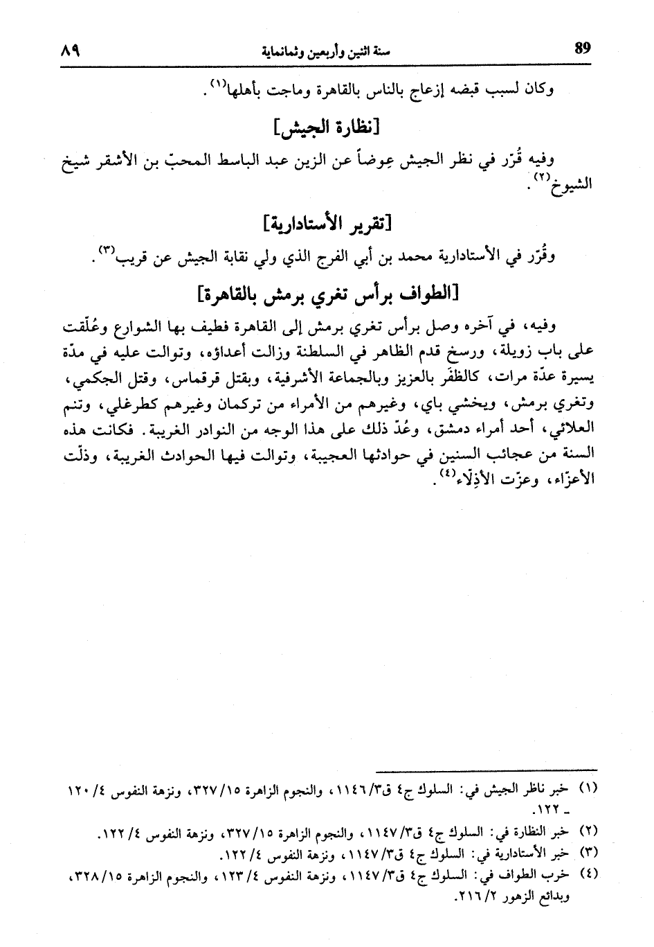 (¬1) خبر ناظر الجيش في: السلوك ج 4 ق 3/ 1146، والنجوم الزاهرة 15/ 327، ونزهة النفوس 4/ 120 - 122.