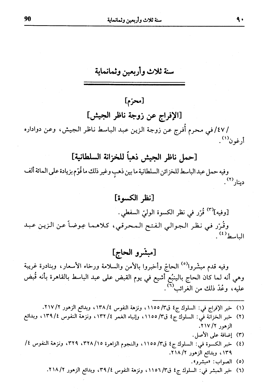 (¬4) خبر الكسوة في: السلوك ج 4 ق 3/ 1155، والنجوم الزاهرة 15/ 328، 329، ونزهة النفوس 4/ 139، وبدائع الزهور 2/ 218.