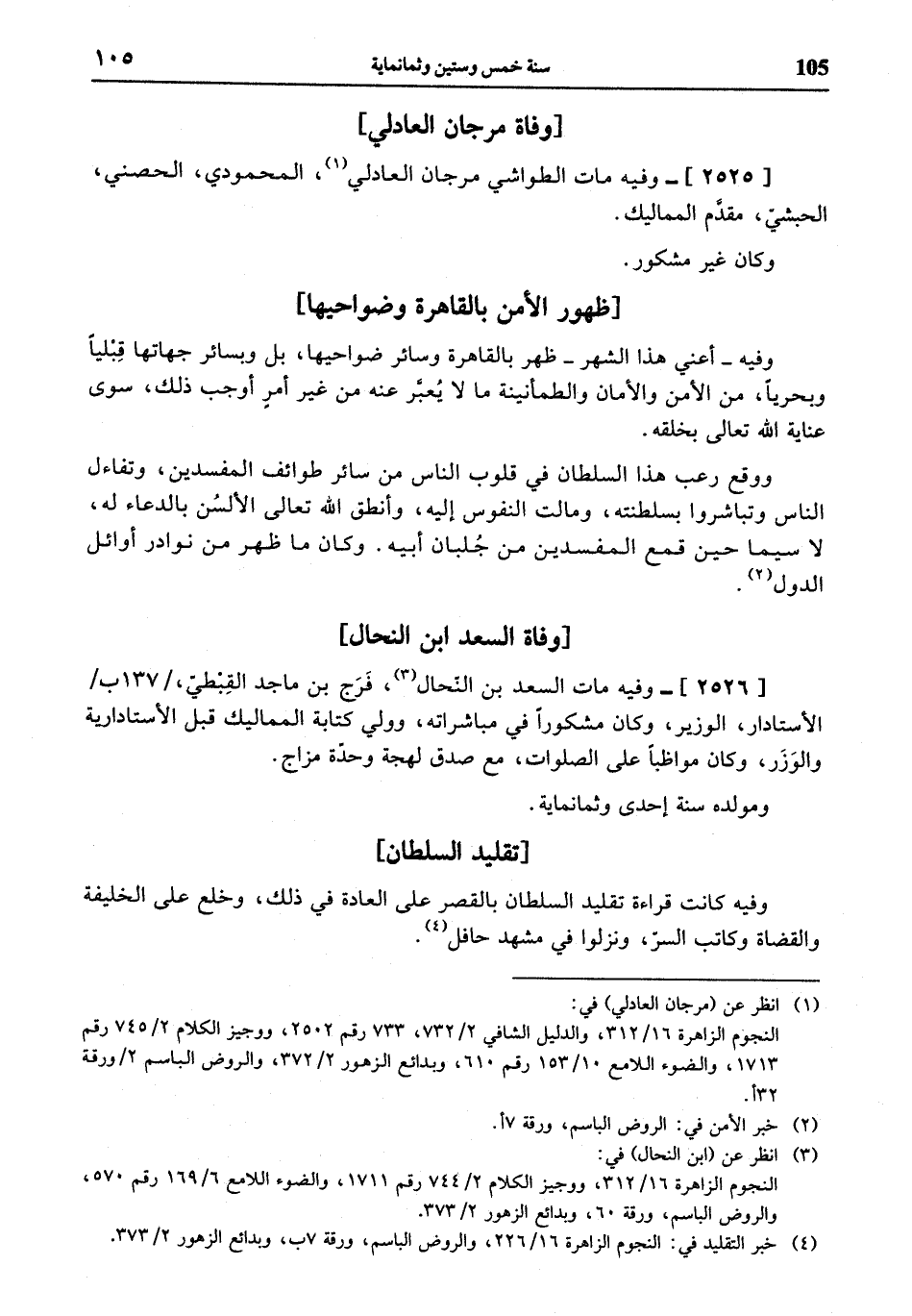 [2526]- وفيه مات السعد بن النّحال (¬3)، فرج بن ماجد القبطيّ، / 137 ب / الأستادار، الوزير، وكان مشكورا في مباشراته، وولي كتابة المماليك قبل الأستادارية والوزر، وكان مواظبا على الصلوات، مع صدق لهجة وحدّة مزاج.