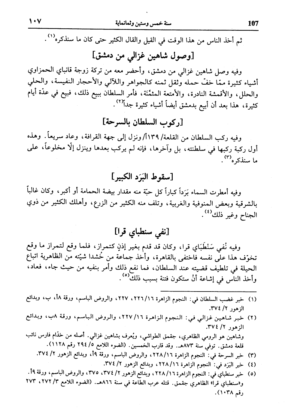 (¬5) خبر سنطباي في: النجوم الزاهرة 16/ 228، وبدائع الزهور 2/ 374، 375، والروض الباسم، ورقة 9 أ. و «سنطباي قرا» الظاهري جقمق. قتله عرب الطاعة في سنة 866 هـ. (الضوء اللامع 3/ 272، 273 رقم 1038).