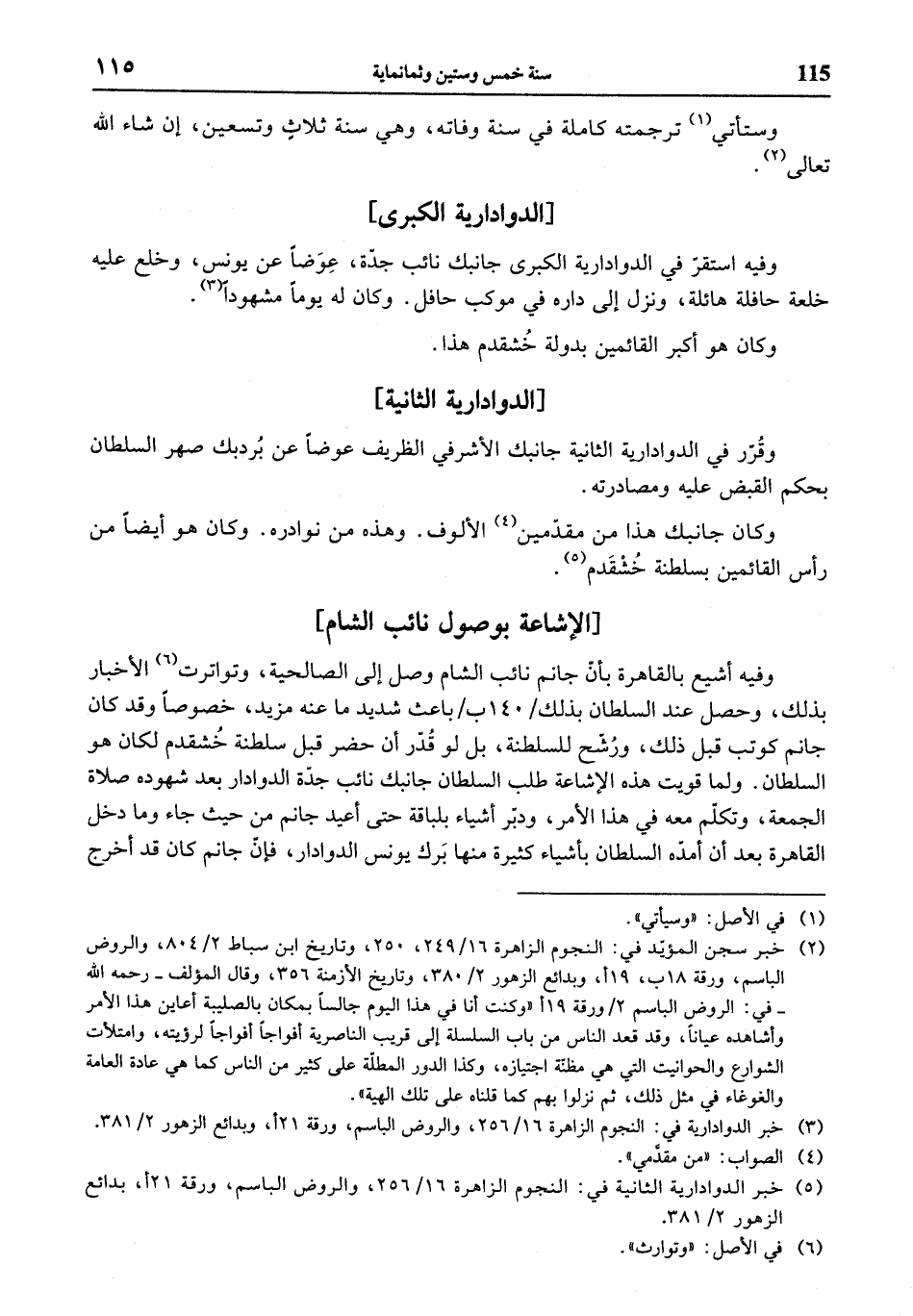 (¬5) خبر الدوادارية الثانية في: النجوم الزاهرة 16/ 256، والروض الباسم، ورقة 21 أ، بدائع الزهور 2/ 381.