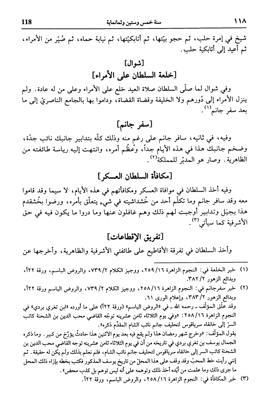 (¬2) خبر سفر جانم في: النجوم الزاهرة 16/ 258، ووجيز الكلام 2/ 739، والروض الباسم ورقة 22 أ، وبدائع الزهور 2/ 383، وإعلام الورى 61. وقد علّق المؤلّف - رحمه الله - في «الروض الباسم» (ورقة 22 أ) على ما أورده «ابن تغري بردي» في النجوم الزاهرة 16/ 258: «وفي يوم الثلاثاء ثامن عشرينه توجّه القاضي محب الدين بن الشحنة كاتب السرّ إلى خانقاه سرياقوس لتحليف جانم نائب الشام المقدّم ذكره». يقول المؤلّف: «وخرج شهر رمضان هذا ولم يقع فيه بعد يوم الاثنين هذا حادث يؤرّخ من كبير. وما ذكره الجمال يوسف بن تغري بردي في تاريخه من أن في يوم الثلاثاء ثامن عشرينه توجه القاضي محب الدين بن الشحنة كاتب السر إلى خانقاه سرياقوس لتحليف جانم نائب الشام، فلم نعلم بذلك ولم يكن له حقيقة. ثم إنني رأيت خط المحبّ وقد وقف على هذا المحلّ من تاريخ يوسف المذكور فكتب بخطه بإزاء ذلك المحل ما جرى ذلك وما علمت من أيّده أخذ ذلك وتوهمه على أنه ليس توهم بل كذب محض».