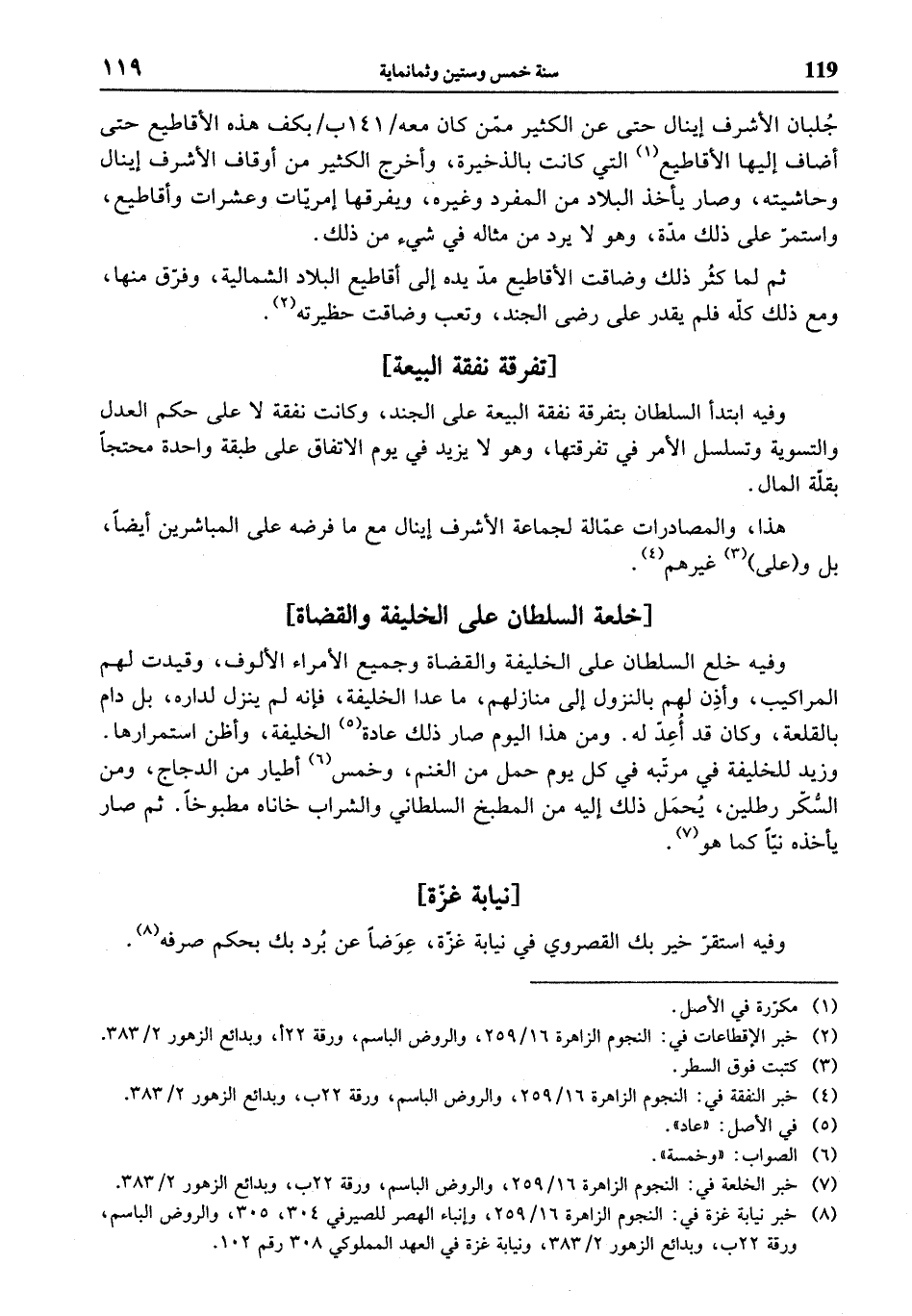 (¬8) خبر نيابة غزة في: النجوم الزاهرة 16/ 259، وإنباء الهصر للصيرفي 304، 305، والروض الباسم، ورقة 22 ب، وبدائع الزهور 2/ 383، ونيابة غزة في العهد المملوكي 308 رقم 102.