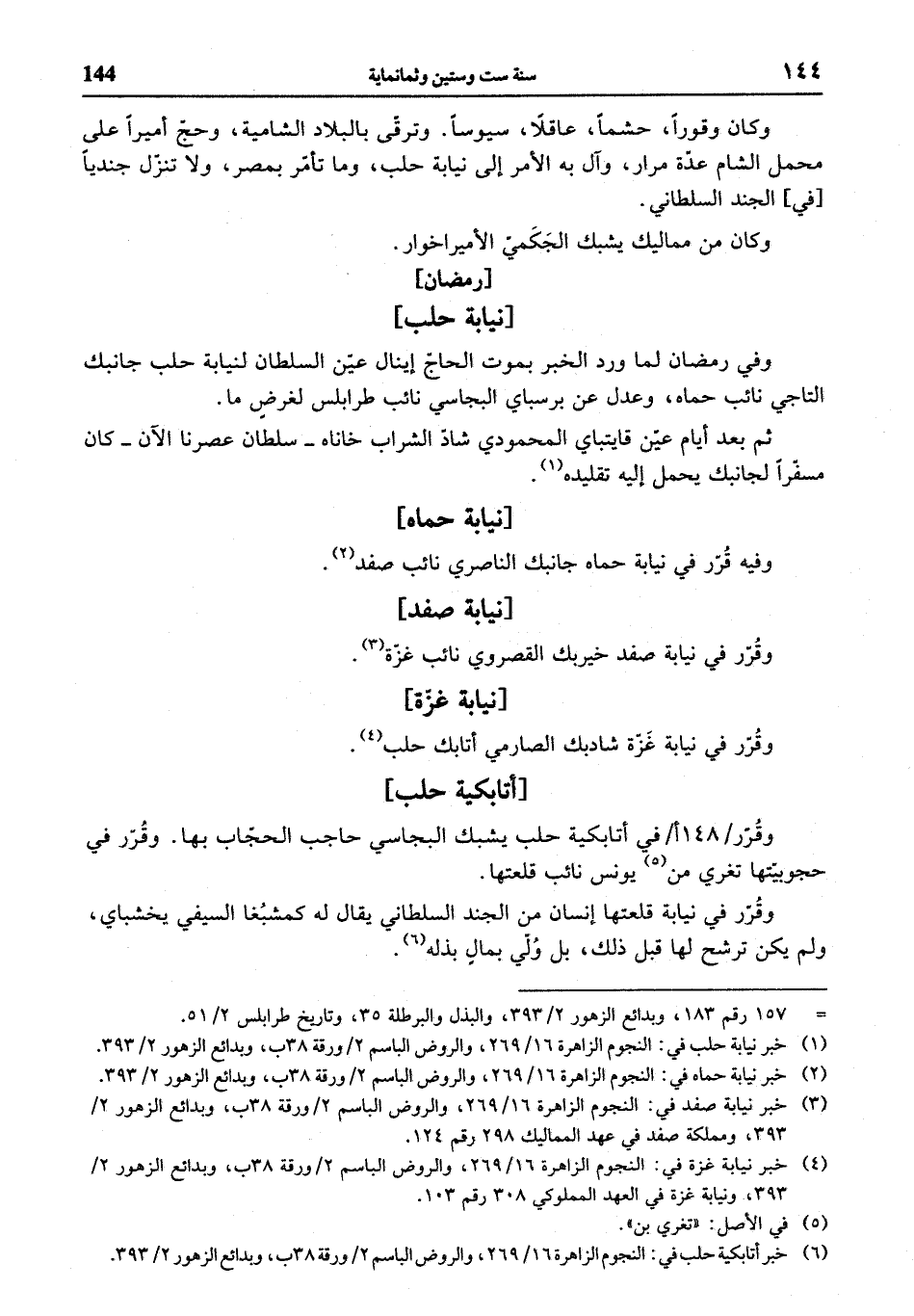 (¬6) خبر أتابكية حلب في: النجوم الزاهرة 16/ 269، والروض الباسم 2 / ورقة 38 ب، وبدائع الزهور 2/ 393.