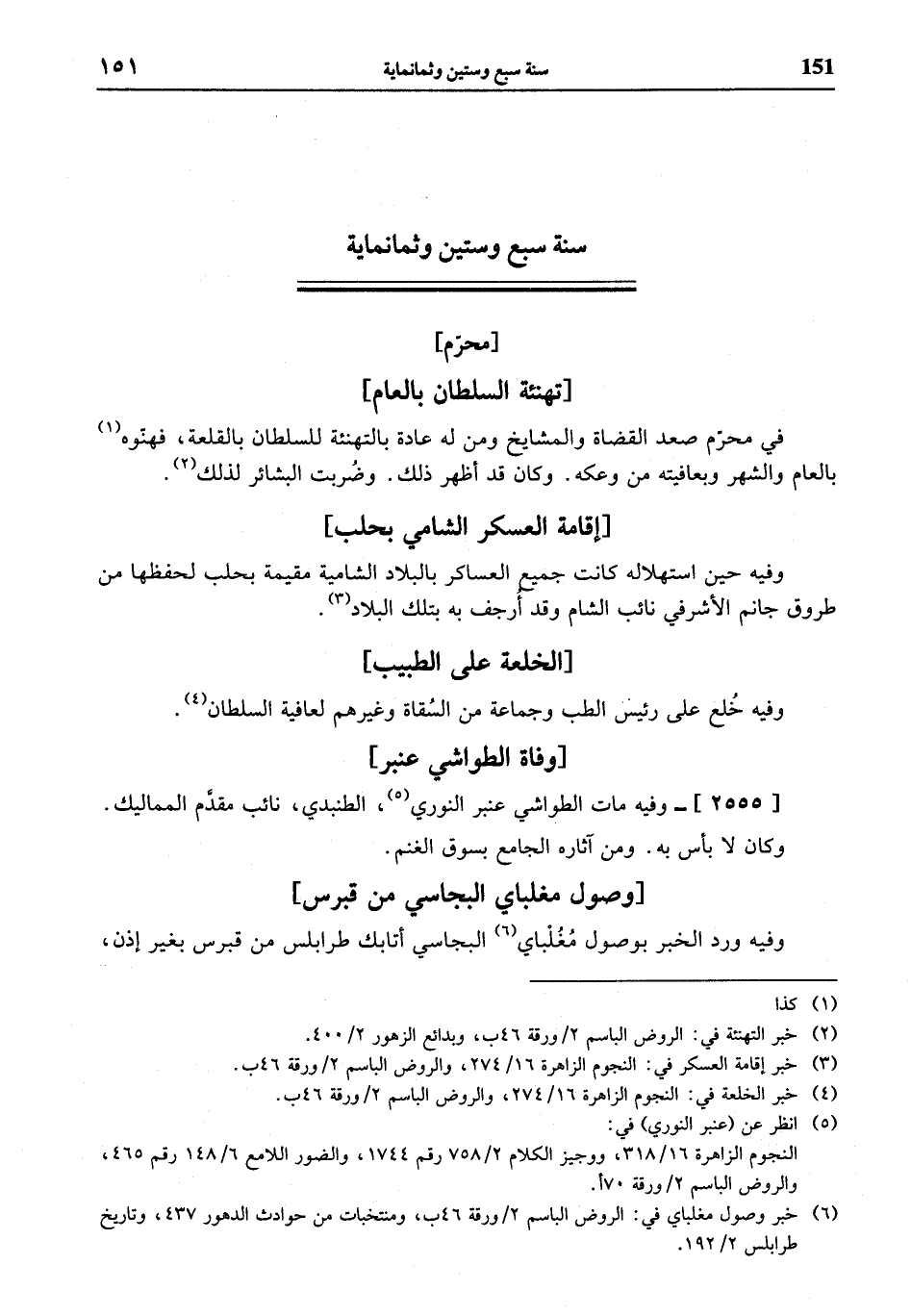 (¬3) خبر إقامة العسكر في: النجوم الزاهرة 16/ 274، والروض الباسم 2 / ورقة 46 ب.