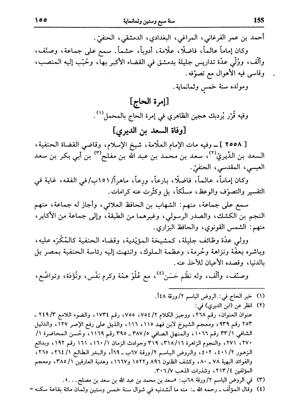 [2558]- وفيه مات الإمام العلاّمة، شيخ الإسلام، وقاضي القضاة الحنفية، السعد بن الدّيريّ (¬2)، سعد بن محمد بن عبد الله بن مفلح (¬3) بن أبي بكر بن سعد العبسي، المقدسي، الحنفيّ.