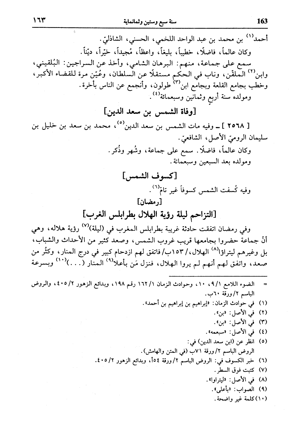 (¬6) خبر الكسوف في: الروض الباسم 2 / ورقة 54 أ، وبدائع الزهور 2/ 405.