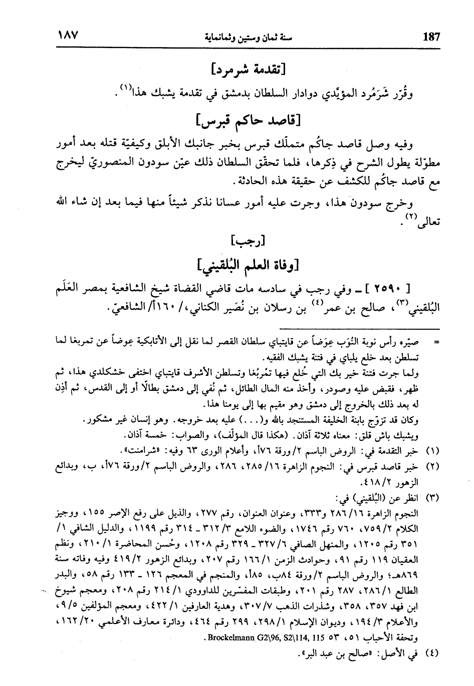 (¬3) انظر عن (البلقيني) في: النجوم الزاهرة 16/ 286 و 333، وعنوان العنوان، رقم 277، والذيل على رفع الإصر 155، ووجيز الكلام 2/ 759، 760 رقم 1746، والضوء اللامع 3/ 312 - 314 رقم 1199، والدليل الشافي 1/ 351 رقم 1205، والمنهل الصافي 6/ 327 - 329 رقم 1208، وحسن المحاضرة 1/ 210، ونظم العقيان 119 رقم 91، وحوادث الزمن 1/ 166 رقم 207، وبدائع الزهور 2/ 419 وفيه وفاته سنة 869 هـ؛ والروض الباسم 2 / ورقة 84 ب، 85 أ، والمنجم في المعجم 126 - 133 رقم 58، والبدر الطالع 1/ 286، 287 رقم 201، وطبقات المفسّرين للداوودي 1/ 214 رقم 208، ومعجم شيوخ ابن فهد 357، 358، وشذرات الذهب 7/ 307، وهدية العارفين 1/ 422، ومعجم المؤلفين 5/ 9، والأعلام 3/ 194، وديوان الإسلام 1/ 298، 299 رقم 464، ودائرة معارف الأعلمي 20/ 162، وتحفة الأحباب 51، 53، Brockelmann G 2\ 96, S 2\ 114,115 .