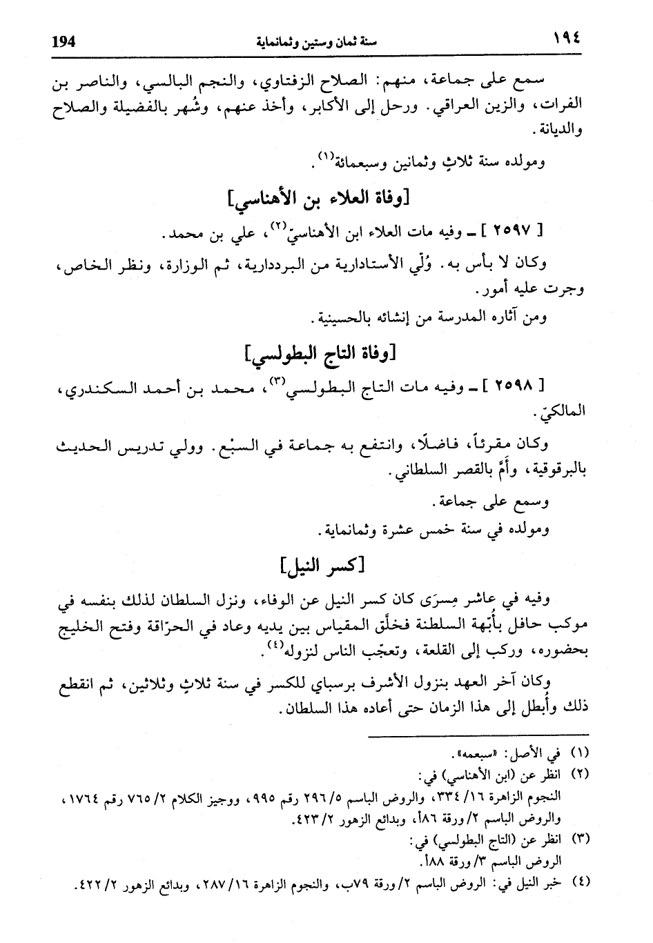 (¬2) انظر عن (ابن الأهناسي) في: النجوم الزاهرة 16/ 334، والروض الباسم 5/ 296 رقم 995، ووجيز الكلام 2/ 765 رقم 1764، والروض الباسم 2 / ورقة 86 أ، وبدائع الزهور 2/ 423.