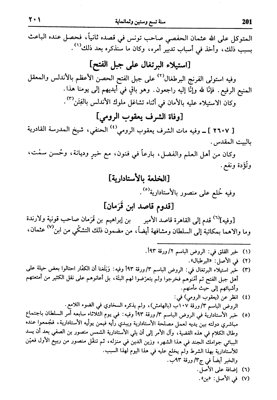 (¬3) خبر استيلاء البرتغال في: الروض الباسم 3 / ورقة 93 أوفيه: وبلغنا أن الكفّار احتالوا بعض حيلة على أهل جبل الفتح ثم أمّنوهم فخرجوا ولم يتعرّضوا لهم البتّة، بل أعانوهم على نقل الكثير من أمتعتهم وأشيائهم إلى حيث مأمنهم.