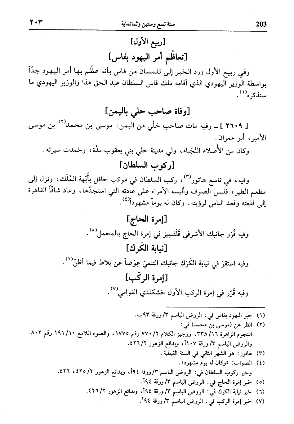 (¬4) الصواب: «وكان له يوم مشهود». وخبر ركوب السلطان في: الروض الباسم 3 / ورقة 94 أ، وبدائع الزهور 2/ 425، 426.