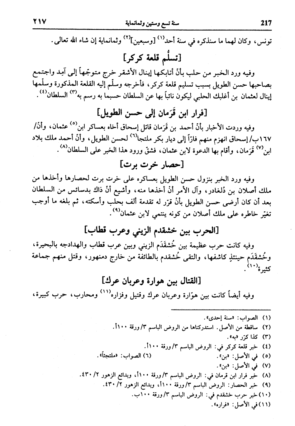 وفيه ورد الخبر من حلب بأنّ أتابكها إينال الأشقر خرج متوجّها إلى آمد واجتمع بصاحبها حسن الطويل بسبب تسليم قلعة كركر، فأخرجه وسلّم إليه القلعة المذكورة وسلّمها إينال لعثمان بن أغلبك الحلبي ليكون نائبا بها عن السلطان حسبما به رسم به (¬3) السلطان (¬4).