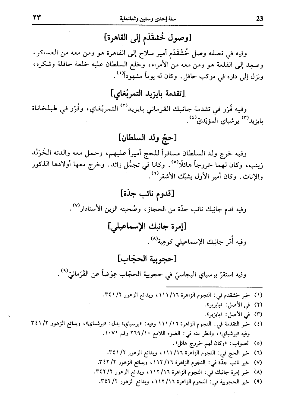 وفيه خرج ولد السلطان مسافرا للحج أميرا عليهم، وحمل معه والدته الخوند زينب، وكان لهما خروجا هائلا (¬5). وكانا في تجمّل زائد. وخرج معها أولادها الذكور والإناث. وكان أمير الأول يشبك الأشقر (¬6).
