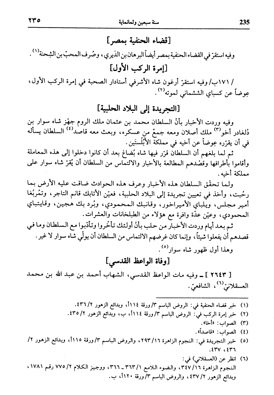 (¬6) انظر عن (العسقلاني) في: النجوم الزاهرة 16/ 347، والضوء اللامع 1/ 363 - 366، ووجيز الكلام 2/ 775 رقم 1781، وبدائع الزهور 2/ 437، والروض الباسم 3 / ورقة 120 أ، ب.