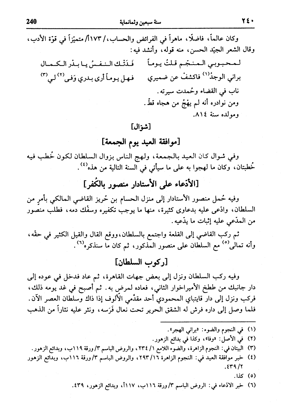 (¬4) خبر موافقة العيد في: النجوم الزاهرة 16/ 293، والروض الباسم 3 / ورقة 116 ب، وبدائع الزهور 2/ 439.