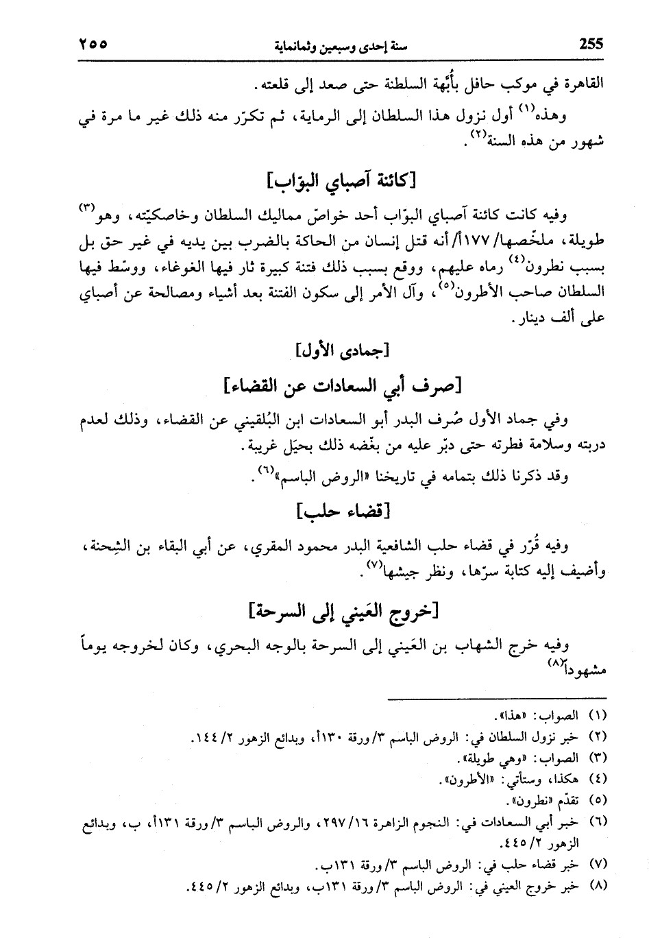 (¬6) خبر أبي السعادات في: النجوم الزاهرة 16/ 297، والروض الباسم 3 / ورقة 131 أ، ب، وبدائع الزهور 2/ 445.