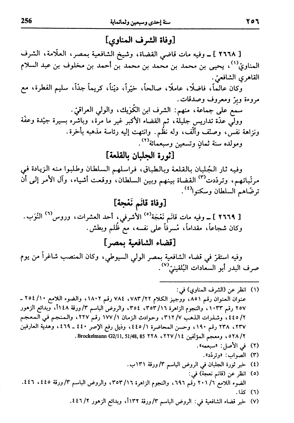 (¬1) انظر عن (الشرف المناوي) في: عنوان العنوان رقم 851، ووجيز الكلام 22/ 783، 784 رقم 1802، والضوء اللامع 10/ 254 - 257 رقم 1033، والنجوم الزاهرة 16/ 353، 354، والروض الباسم 3 / ورقة 148 أ، وبدائع الزهور 2/ 445، وشذرات الذهب 7/ 312، وحوادث الزمان 1/ 177 رقم 227، والمنجم في المعجم 237، 238 رقم 190، وحسن المحاضرة 1/ 445، وذيل رفع الإصر 440 - 469، وهدية العارفين 2/ 528، ومعجم المؤلفين 14/ 227، 228، Brockelmann G 2/ 11, 51/ 84,85.