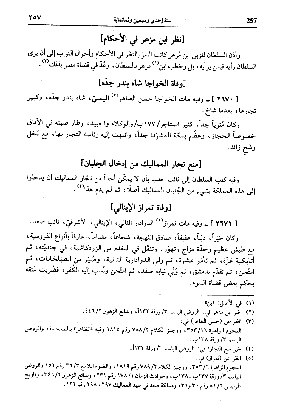 (¬5) انظر عن (تمراز) في: النجوم الزاهرة 6/ 353، ووجيز الكلام 2/ 789 رقم 1819، والضوء اللامع 3/ 36 رقم 151 والروض الباسم 3 / ورقة 137 ب - 138 ب، وحوادث الزمان 1/ 178 رقم 231، وبدائع الزهور 2/ 346، وتاريخ طرابلس 2/ 81 رقم 30 و 31، ومملكة صفد في عهد المماليك 297، 298 رقم 122.