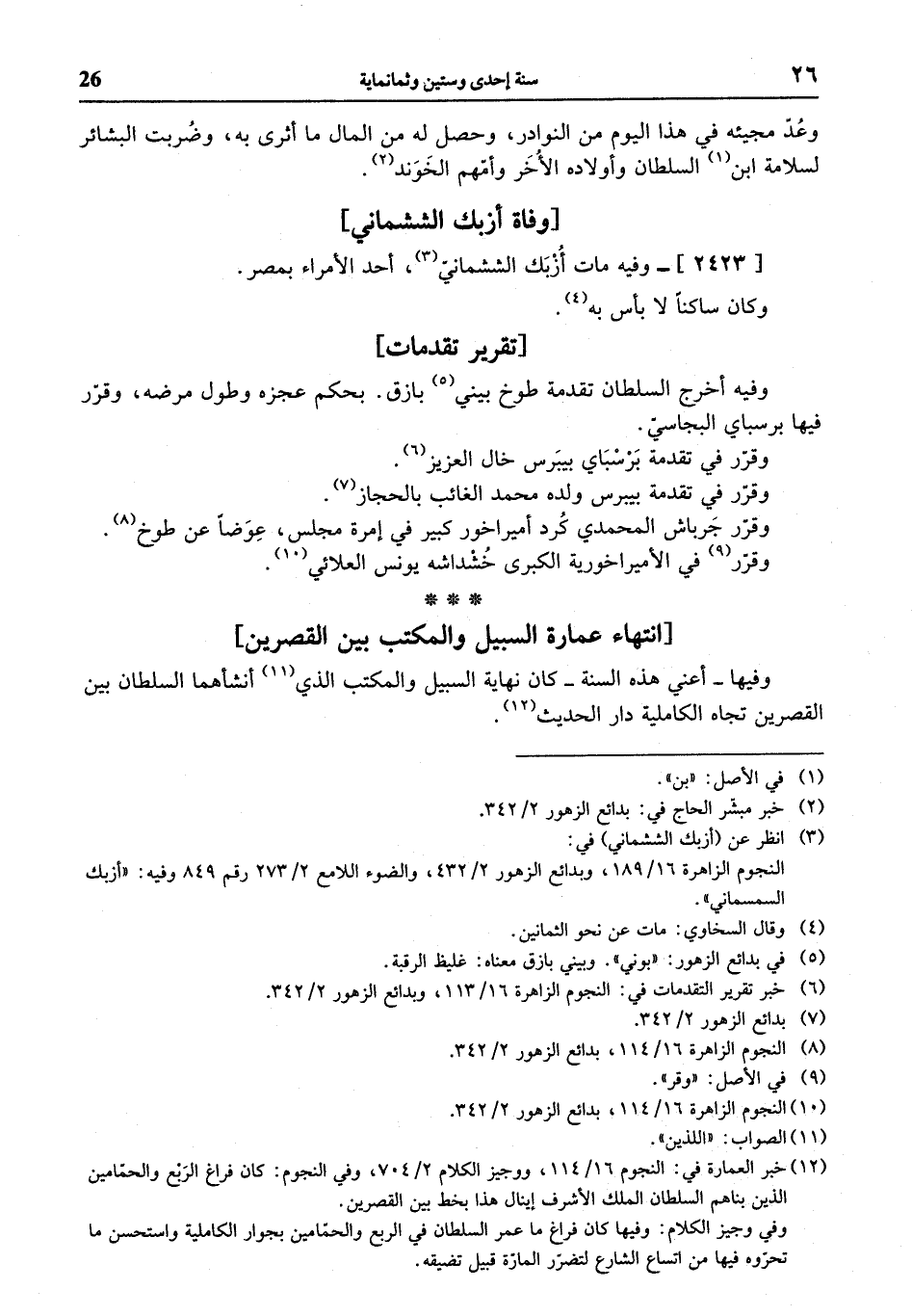 (¬3) انظر عن (أزبك الششماني) في: النجوم الزاهرة 16/ 189، وبدائع الزهور 2/ 432، والضوء اللامع 2/ 273 رقم 849 وفيه: «أزبك السمسماني».