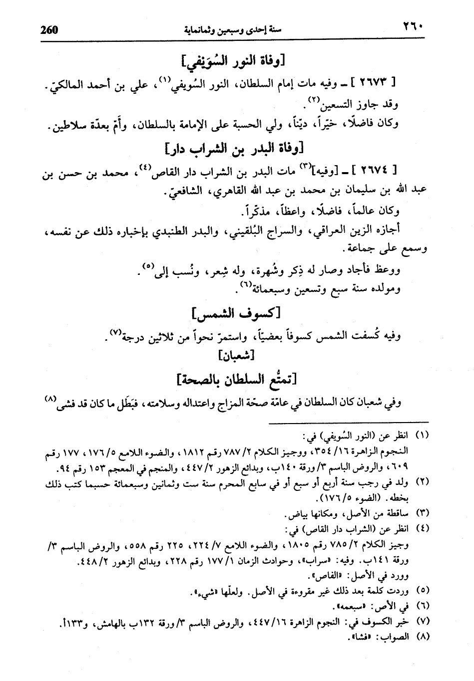 (¬1) انظر عن (النور السويفي) في: النجوم الزاهرة 16/ 354، ووجيز الكلام 2/ 787 رقم 1812، والضوء اللامع 5/ 176، 177 رقم 609، والروض الباسم 3 / ورقة 140 ب، وبدائع الزهور 2/ 447، والمنجم في المعجم 153 رقم 94.