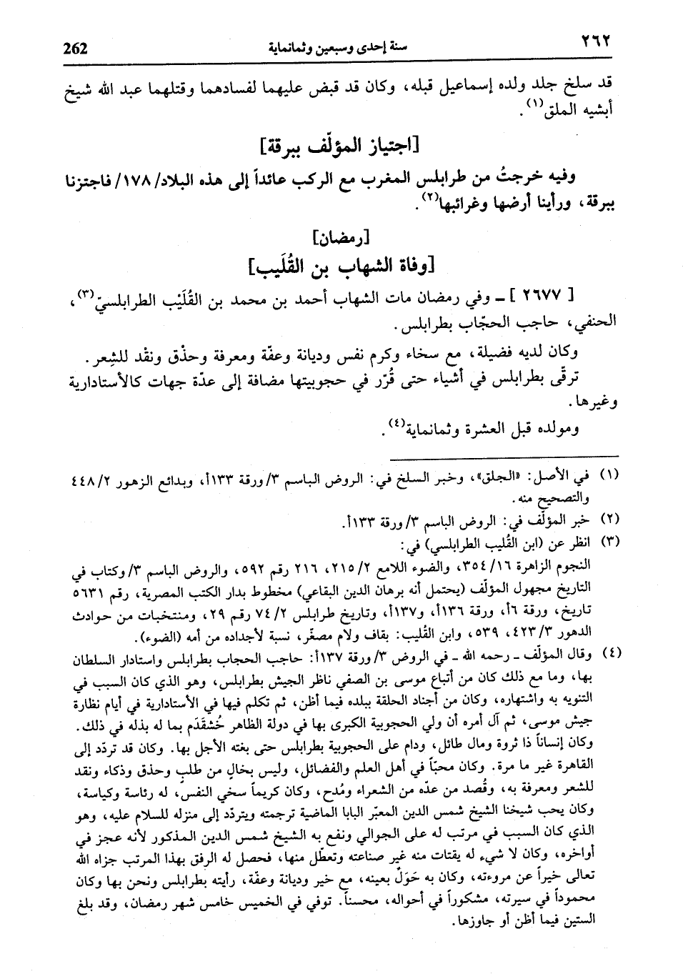 (¬3) انظر عن (ابن القليب الطرابلسي) في: النجوم الزاهرة 16/ 354، والضوء اللامع 2/ 215، 216 رقم 592، والروض الباسم 3 / وكتاب في التاريخ مجهول المؤلّف (يحتمل أنه برهان الدين البقاعي) مخطوط بدار الكتب المصرية، رقم 5631 تاريخ، ورقة 6 أ، ورقة 136 أ، و 137 أ، وتاريخ طرابلس 2/ 74 رقم 29، ومنتخبات من حوادث الدهور 3/ 423، 539، وابن القليب: بقاف ولام مصغّر، نسبة لأجداده من أمه (الضوء).